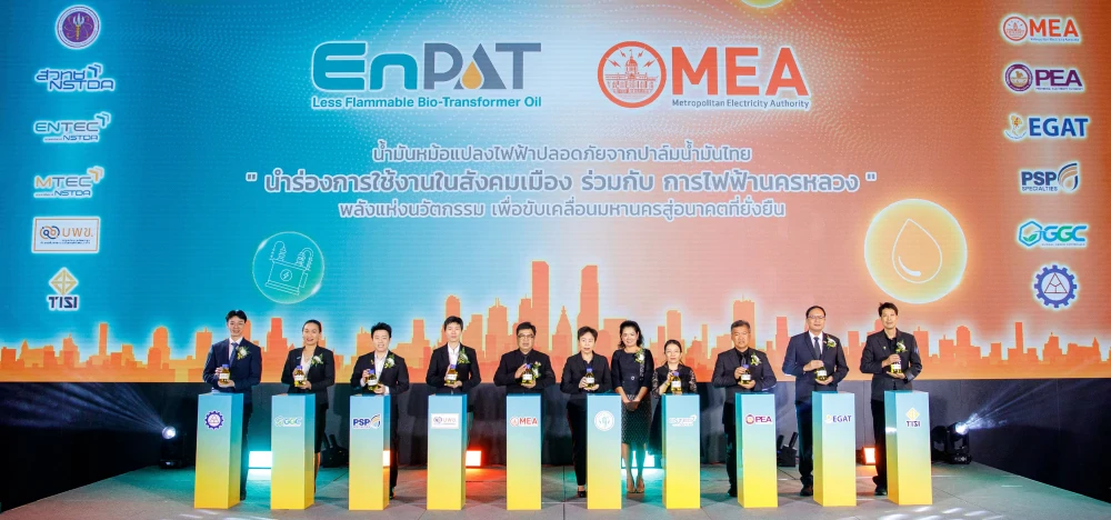 (4 ธันวาคม 2568) ดร.ธัญญรัตน์ บุญถีกูล ผู้จัดการฝ่ายหน่วยงานการตลาดและพัฒนาธุรกิจ บริษัท โกลบอลกรีนเคมิคอล จํากัด (มหาชน) หรือ GGC เป็นผู้แทนบริษัทฯ ร่วมงานแถลงข่าวการใช้งาน EnPAT น้ำมันหม้อแปลงไฟฟ้าปลอดภัยจากปาล์มน้ำมันไทยในระบบไฟฟ้าสังคมเมือง โดยมีนายดิเรก บุญปิยทัศน์ รองผู้ว่าการวางแผนและนวัตกรรมระบบไฟฟ้า การไฟฟ้านครหลวง (กฟน.) เป็นประธานในงาน พร้อมด้วยหน่วยงานพันธมิตรที่เกี่ยวข้องร่วมประกาศความพร้อมในการนำ EnPAT ไปใช้งานจริง ภายใต้แนวคิด “EnPAT พลังแห่งนวัตกรรม เพื่อขับเคลื่อนมหานครสู่อนาคตที่ยั่งยืน” ณ อาคารวัฒนวิภาส B การไฟฟ้านครหลวง สำนักงานใหญ่ กรุงเทพมหานคร