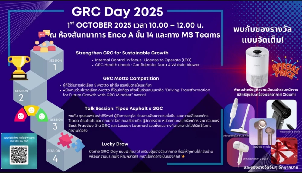 การอบรมดังกล่าวเน้นย้ำให้พนักงานยึดถือ จรรยาบรรณทางธุรกิจ และดำเนินงานด้วยความ โปร่งใส ตรวจสอบได้ โดยในปี 2568 กิจกรรมของ GRC day มีเนื้อหาที่ เกี่ยวข้องกับ Strengthen GRC for sustainable Growth ทั้งการบริหารจัดการภายใน ข้อมูลที่เป็นความลับ และผู้เปิดเผยข้อมูล รวมไปถึงการยกตัวอย่างการดำเนินงานด้าน GRC รวมทั้งแนวทางที่สามารถนำไปปรับไปใช้ได้จริง